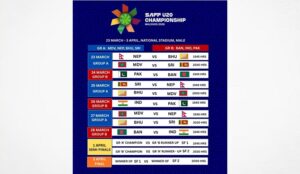 नेपाल रहेको समूह ‘ए’ मा आयोजक माल्दिभ्ससँगै श्रीलङ्का र भूटान पनि छन् । नेपालले दोस्रो खेल चैत ११ गते श्रीलङ्कासँग खेल्नेछ भने समूह चरणको अन्तिम खेल १३ गते आयोजक माल्दिभ्ससँग खेल्नेछ । समूह ‘बी’ मा बङ्गलादेश, भारत र पाकिस्तान छन् ।